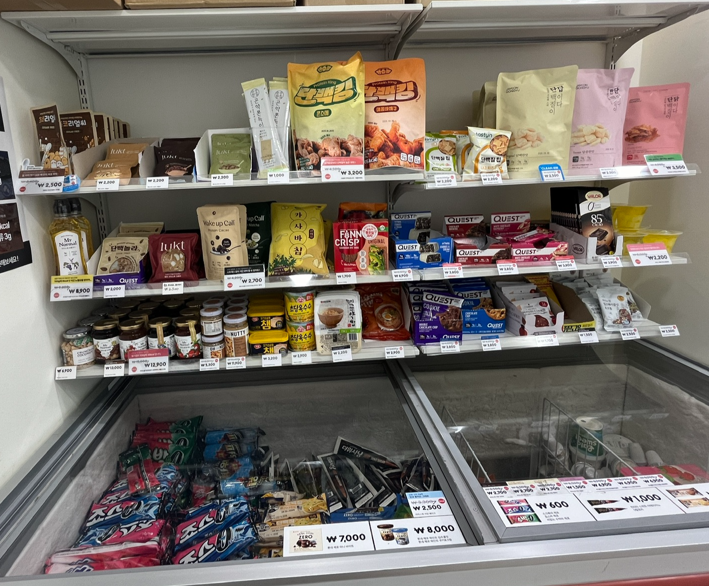 출입문을 열면 오른쪽 벽면에는 음료와 저당소스, 단백질 쉐이크, 디저트류가 있습니다.