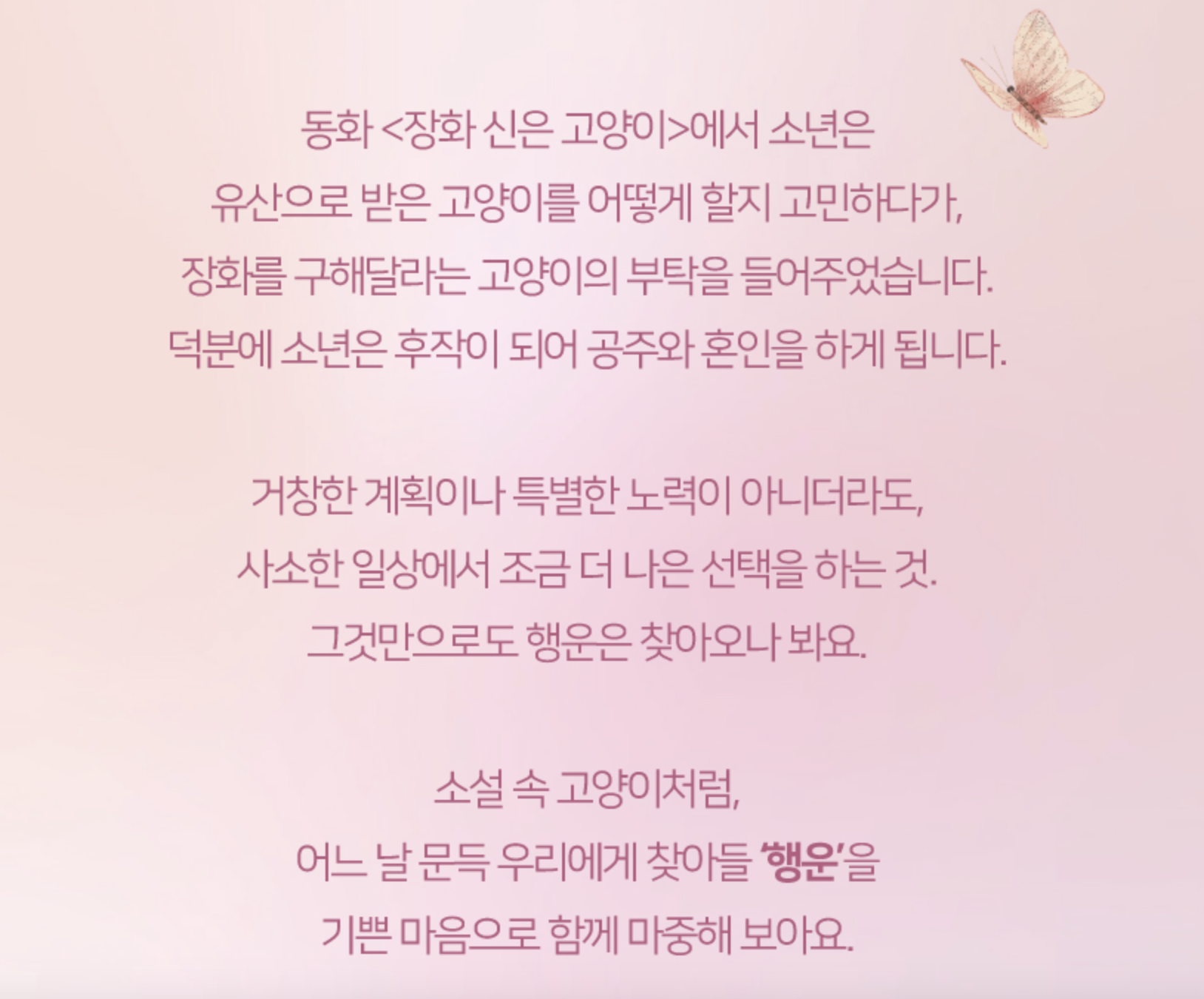 동화 "장화 신은 고양이" 내용처럼 소소한 일상에서 여러분에게 행운이 찾아오길 바라요!
