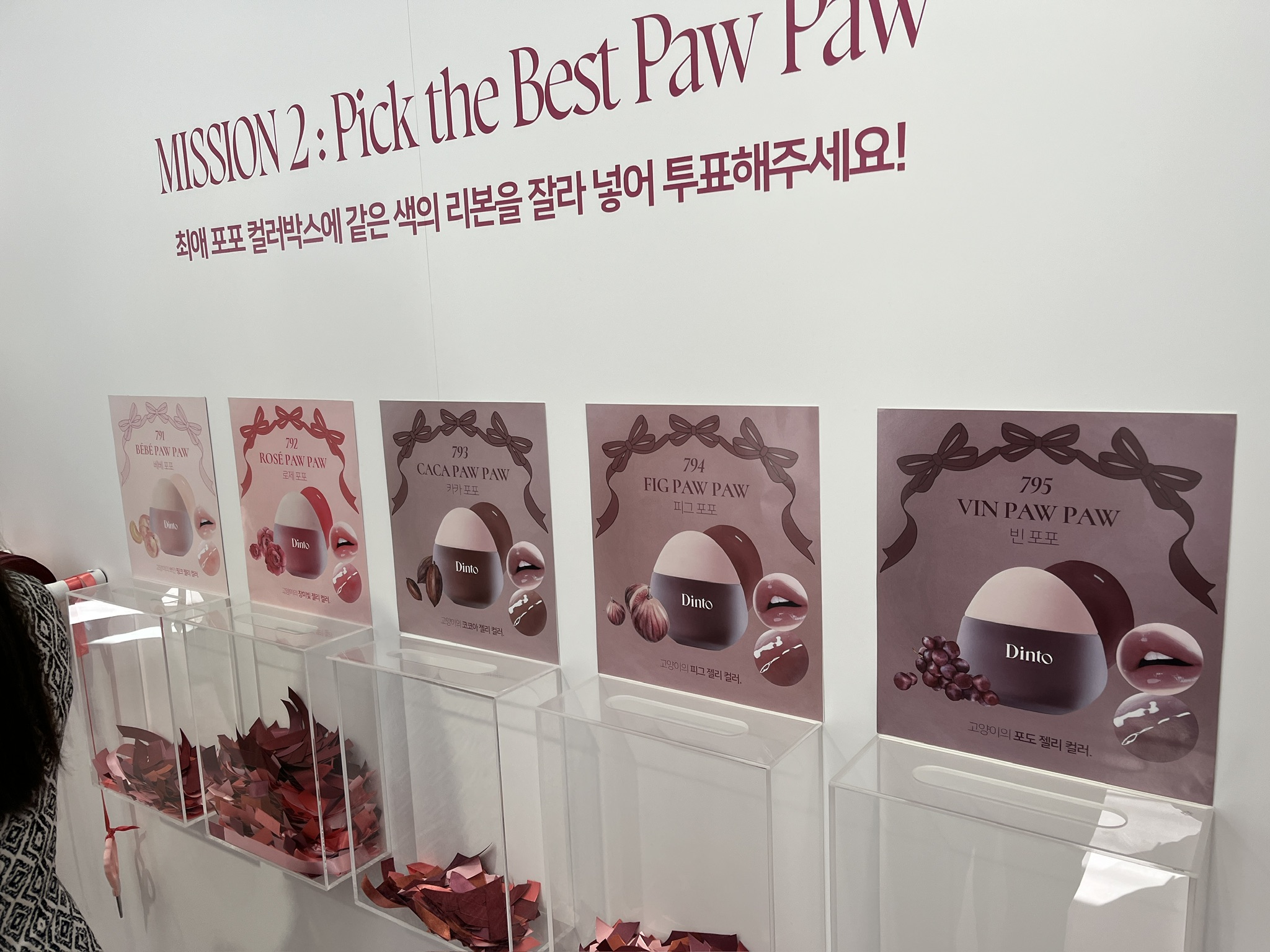5종의 포포 립마스크를 발색하고 마음에 드는 제품에 리본으로 투표하면 2단계 미션도 끝이 납니다.