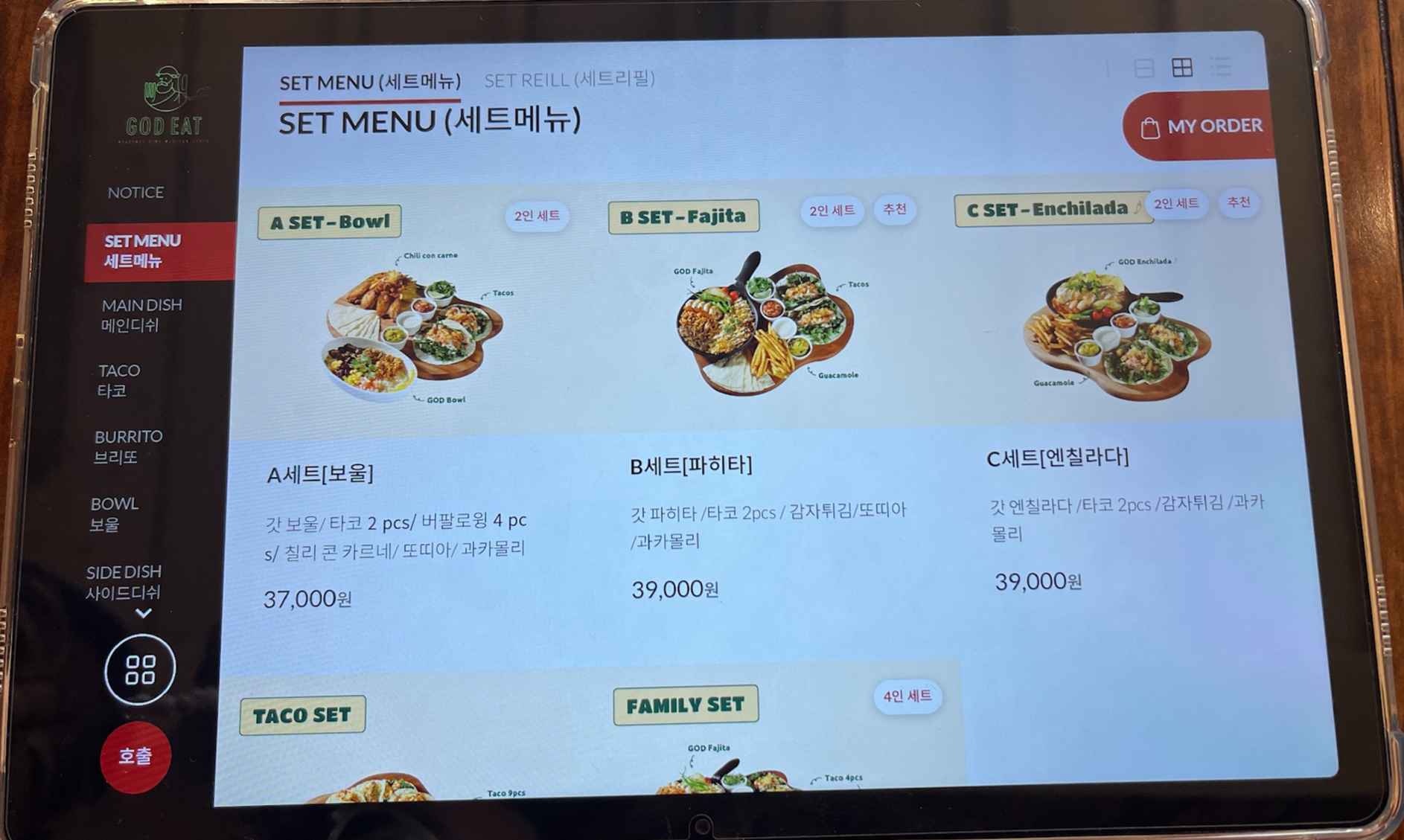 3인 기준으로 세트메뉴하나에 타코를 추가하면 배부르게 드실 수 있어요!