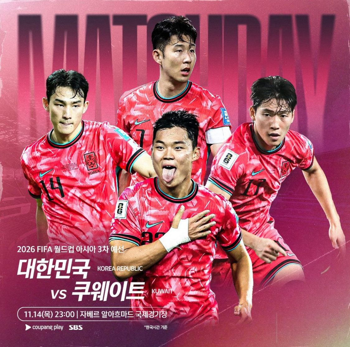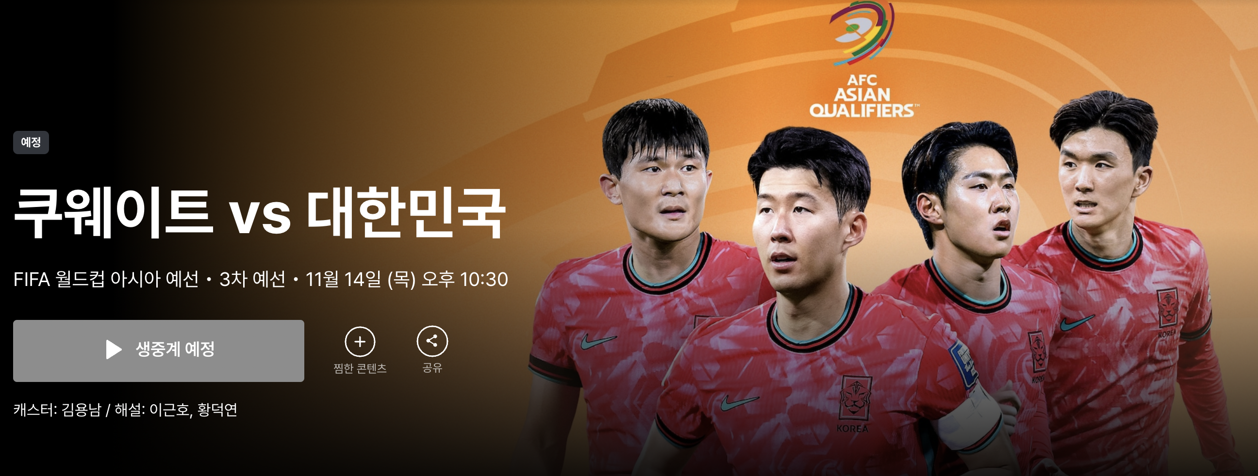 대한민국 VS 쿠웨이트의 경기는 한국 시간으로 11월 14일 목요일 저녁 11시에 시작이 됩니다.