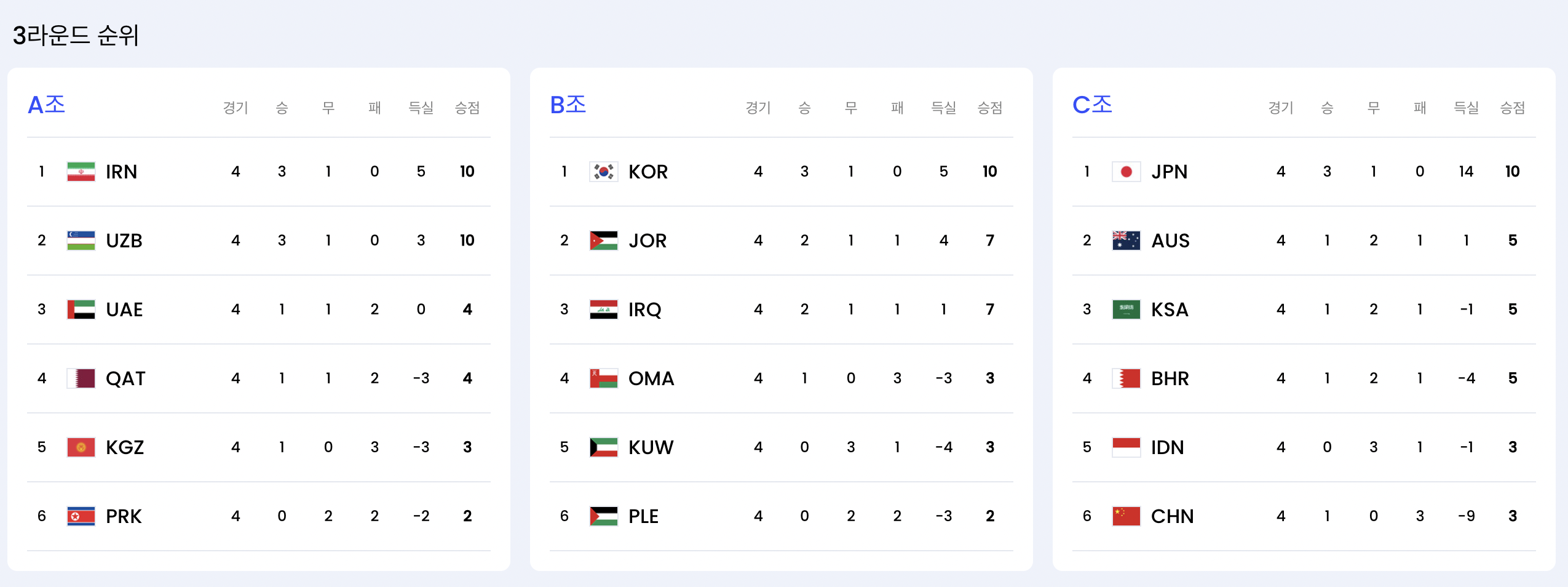 현재 무패행진으로(3승・1무・승점10) 달려온 한국은 B조 선두에 올라와 있습니다.